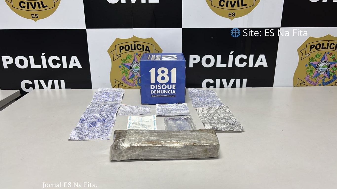Após denúncias anônimas e monitoramento da movimentação intensa no local, os policiais civis entraram no imóvel e encontraram uma barra de maconha e “catuques” — bilhetes trocados entre presos e pessoas em liberdade, usados para comunicação entre integrantes de facções criminosas.