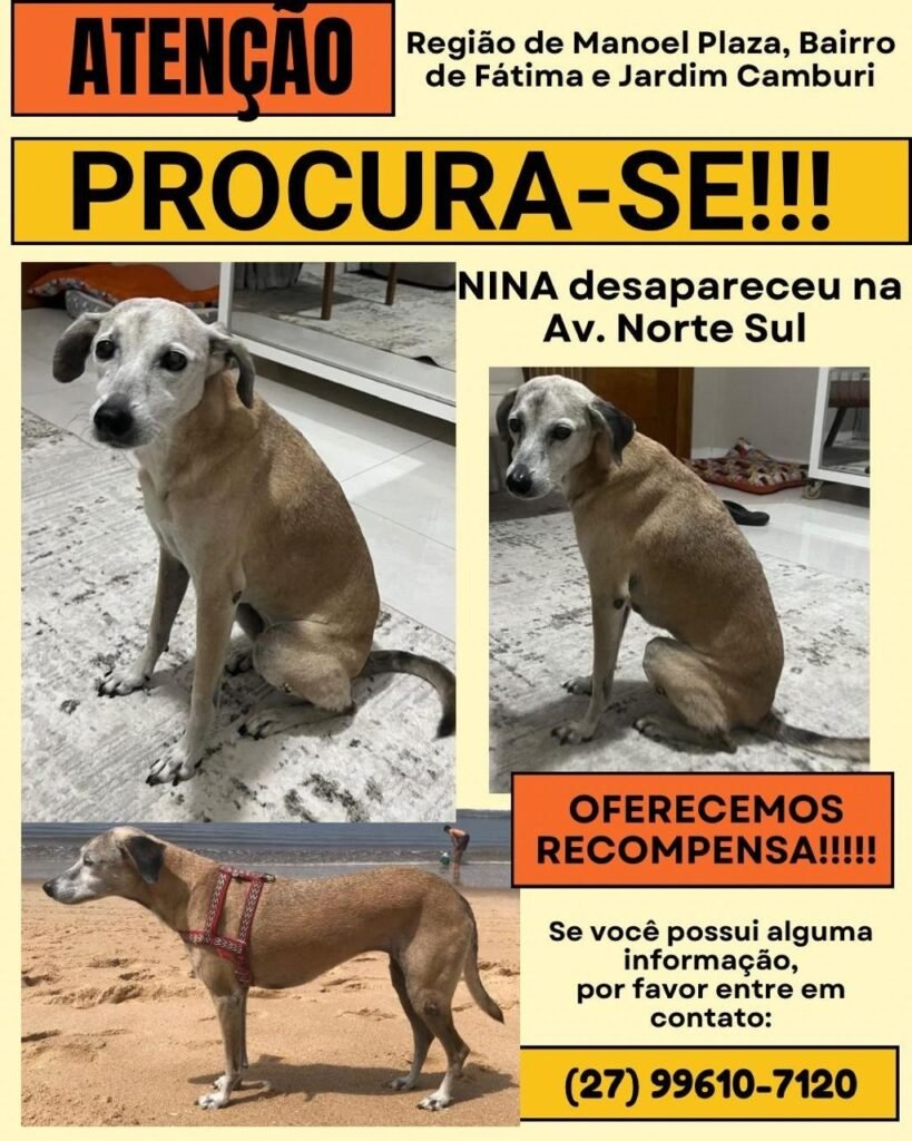 O desaparecimento de uma cadela tem provocado forte mobilização entre moradores e internautas no município da Serra. A vira-lata fêmea, chamada Nina, está desaparecida desde a manhã do dia 2 de março, quando foi vista pela última vez durante uma caminhada com o tutor nas proximidades da descida da Avenida Norte Sul, pouco antes do Supermercado BH.