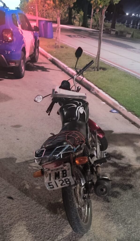 Durante patrulhamento preventivo, agentes da Guarda de Vitória perceberam dois indivíduos parados ao lado de uma motocicleta, aparentando mexer no veículo. A atitude chamou a atenção pela placa estar dobrada — infração de trânsito que levantou suspeitas e motivou a abordagem.