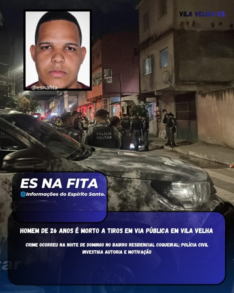 Um homem de 26 anos, identificado como Marcos Vinícius dos Santos Loyola, foi assassinado a tiros na noite deste último domingo (15), no bairro Residencial Coqueiral, no município de Vila Velha.