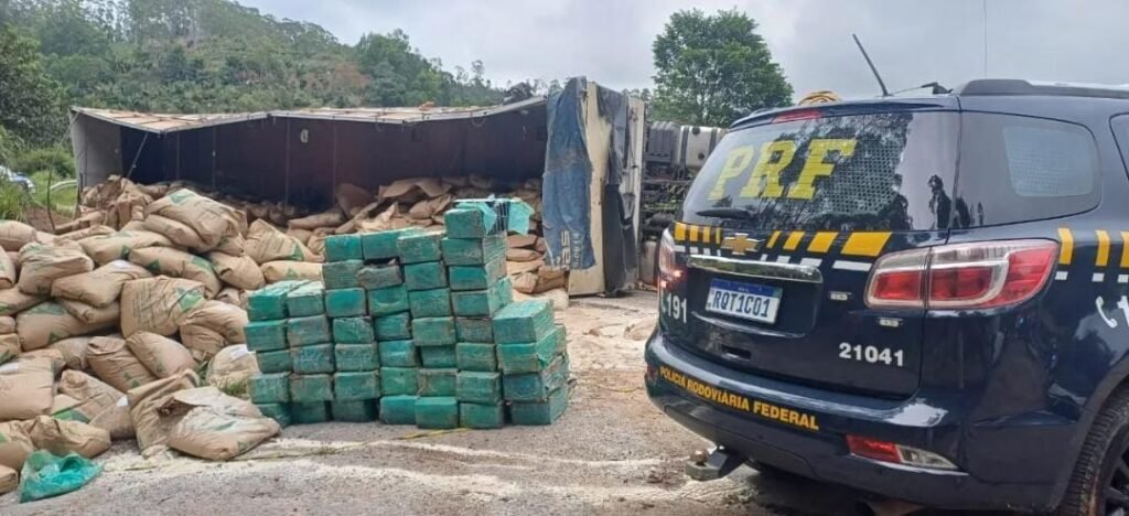 Um acidente registrado na manhã deste sábado (26), no km 64 da BR-262, em Marechal Floriano, na Região Serrana do Espírito Santo, terminou com a apreensão de aproximadamente 884 kg de maconha. A droga estava escondida no meio de uma carga de aveia em flocos, que se espalhou pela rodovia após o tombamento da carreta. Parte da carga ilícita foi saqueada por populares antes da chegada da Polícia Rodoviária Federal (PRF) e da Polícia Militar (PM).