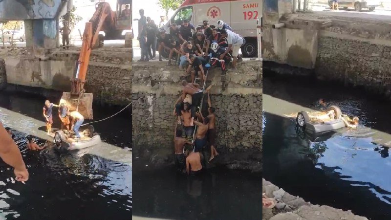 De acordo com testemunhas, o motorista estava realizando exames em um laboratório nas proximidades do local. Quando deixou a garagem do prédio, manobrou o veículo para trás e acabou caindo no valão que fica sob a Terceira Ponte. O carro, que ficou completamente submerso e com as rodas para cima, exigiu um esforço conjunto para ser resgatado. Nossa equipe teve acesso ao vídeo que mostra o momento exato registrado por uma câmera de um celular. Confira o vídeo.