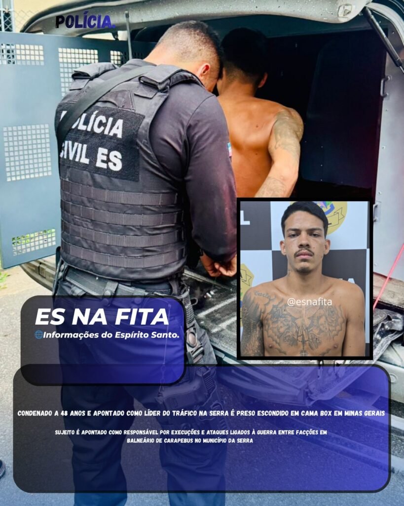 A Polícia Civil do Espírito Santo (PCES) prendeu, no município de Governador Valadares, um homem de 22 anos identificado como Ryan Inácio Silva, conhecido como “Sementinha”, apontado como uma das principais lideranças do tráfico de drogas no bairro Balneário de Carapebus, no município da Serra.