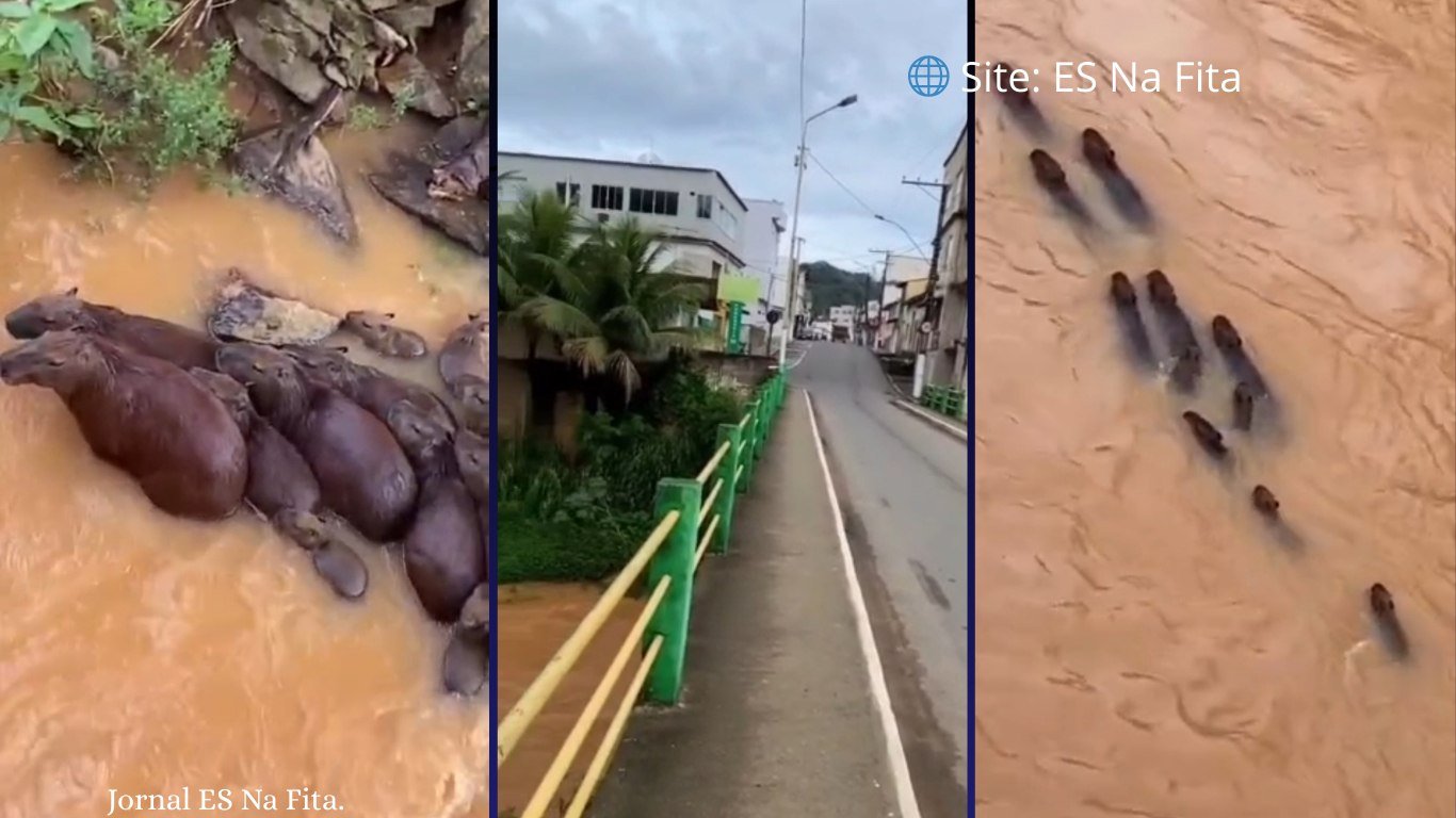 Uma manada de capivaras foi flagrada nadando na correnteza do Rio Fundão, no município de Fundão, após a elevação do nível das águas provocadas pelas chuvas que atingiram a região na última semana. O fenômeno foi intensificado por precipitações registradas também em Santa Teresa, na Região Serrana do Espírito Santo.