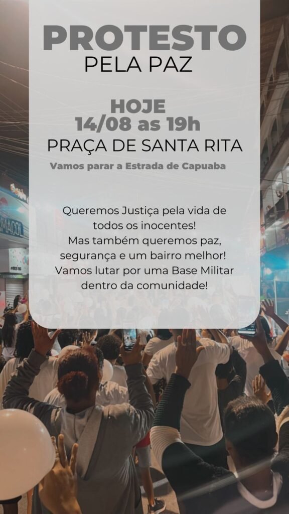 Na noite desta quinta-feira (14), moradores realizaram um outro protesto pacífico na Praça de Santa Rita. Eles querem paz e justiça pela vida de todos os inocentes.