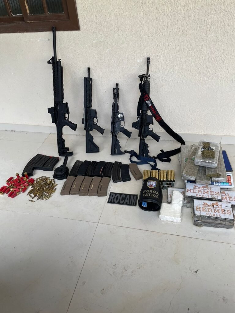 As diligências levaram as equipes até uma residência no bairro Balneário Ponta da Fruta, também em Vila Velha. No local, os policiais encontraram quatro fuzis, diversas munições, mais entorpecentes e uma quantia em dinheiro ainda não contabilizada.