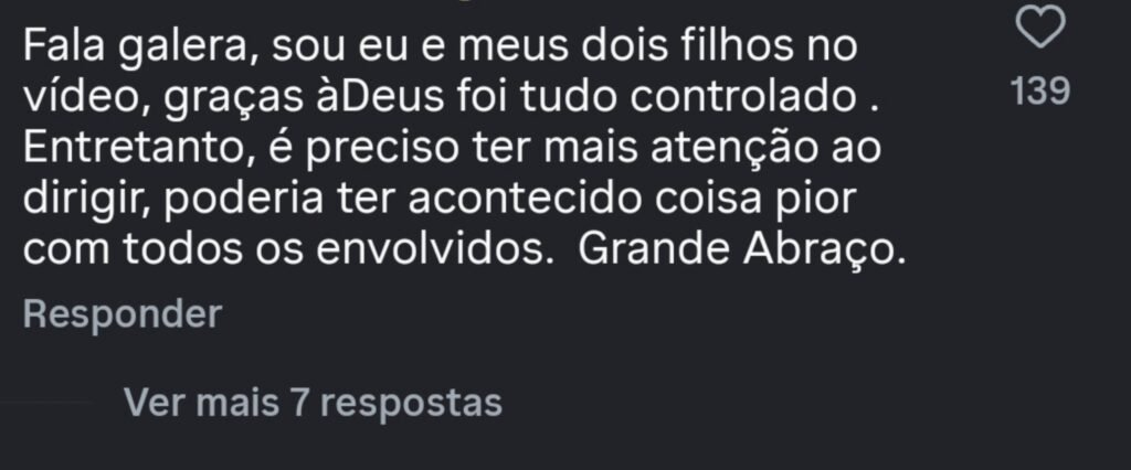 “Fala galera, sou eu e meus dois filhos no vídeo. Graças a Deus foi tudo controlado. Entretanto, é preciso ter mais atenção ao dirigir. Poderia ter acontecido coisa pior com todos os envolvidos. Grande abraço, disse Thiago.
