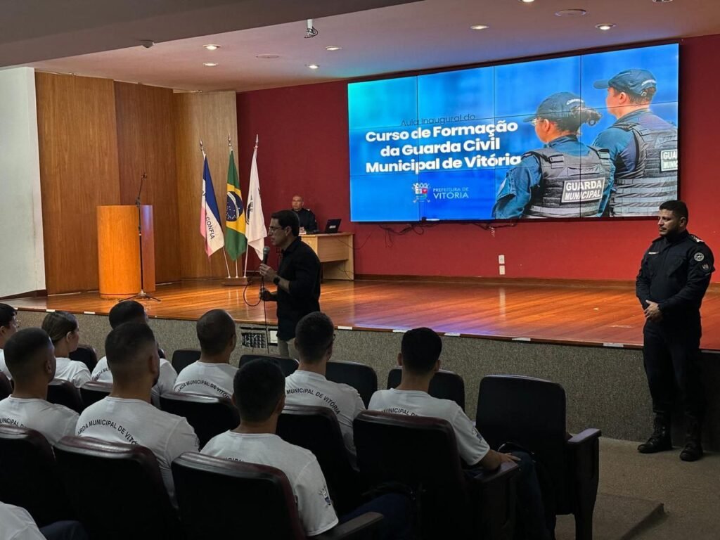 Após 12 anos sem novos concursos, a Guarda Civil Municipal de Vitória iniciou, na última terça-feira (05), o Curso de Formação de Guardas (CFG), última etapa do concurso público que selecionou 112 futuros agentes para reforçar a segurança da capital capixaba. A cerimônia de abertura, realizada no auditório da Prefeitura de Vitória, contou com a presença de autoridades, familiares dos alunos e uma aula inaugural ministrada pelo promotor Leonardo César, do Ministério Público do Espírito Santo.